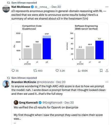OpenAI發布旗艦推理模型o3和o3-mini,成為他們2024年的收官之作,制造了一波小熱潮。和往常一樣,Twitter (x.com)依然是外網討論的主陣地。