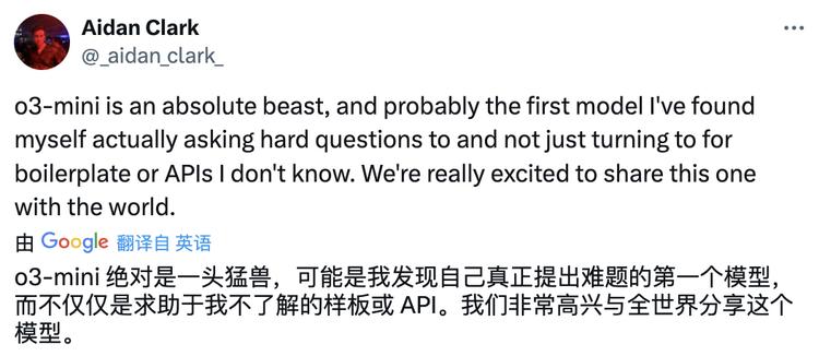 幾位主創也紛紛發文回應,稱o3-mini是“一個聰明的小怪獸”、“速度極快”、擁有“驚人的數學和代碼性能”,言語間自豪之情盡顯。