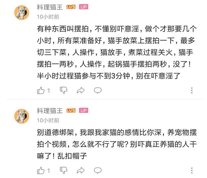 由于視頻中經常會出現貓爪握刀或處理食材的鏡頭,有觀眾認為這種行為有些危險,也有人覺得衛生安全問題存在隱患,主人對此回復“半小時過程貓參與不到三分鐘,別道德綁架”。