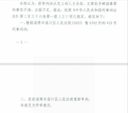 據悉,2024年4月17日,淄博市中院《刑事裁定書》認為王長征、王策犯尋釁滋事罪的事實不清、證據不足。裁定如下:撤銷淄川區法院《刑事判決書》,發回淄川區法院重新審判。