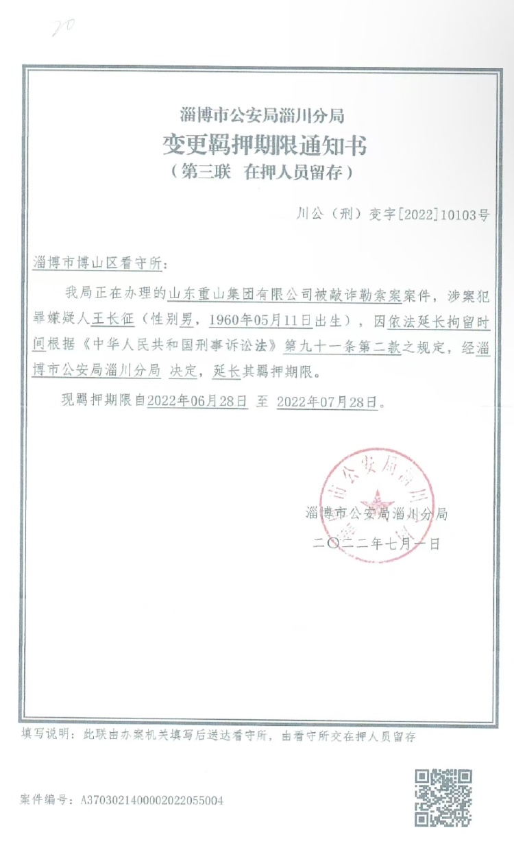 根據2022年7月1日公安淄川分局出具的《變更羈押期限通知書》顯示,王長征涉及的系“山東重山集團有限公司被敲詐勒索案”。