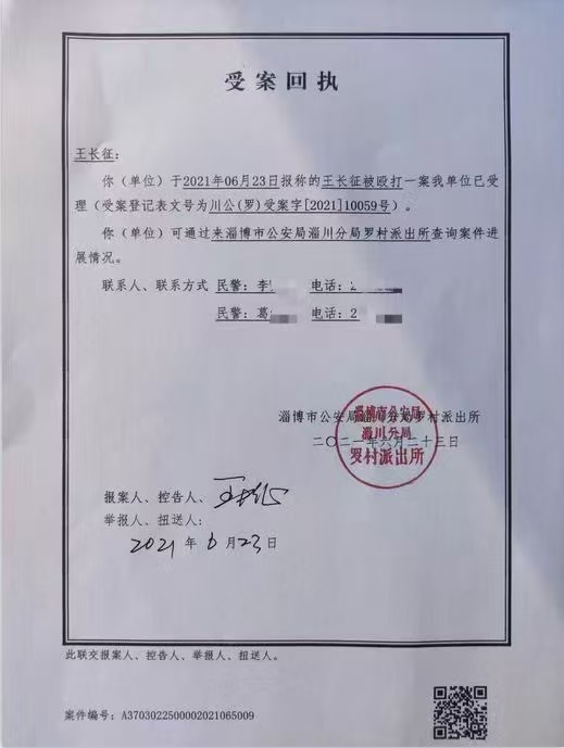 6月23日,王長征與山東重山集團保安陳某發生沖突。王策說,“我爸認為對方是盯梢他,雙方進而發生了沖突。”同日,公安淄川分局羅村派出所出具《受案回執》顯示,“王長征被毆打一案,我單位已受理”。
