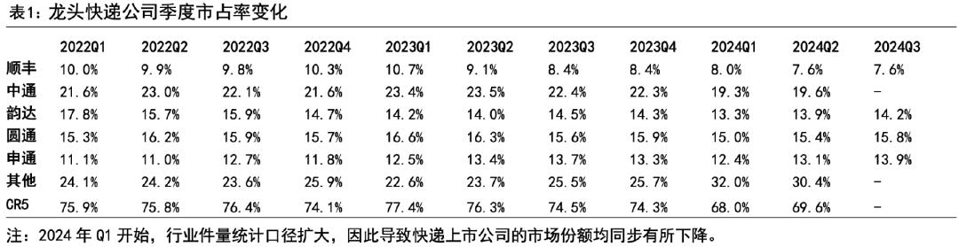 同時,“時效快遞”屬于“小而美”的業務,其他快遞都與電商平臺進行綁定,時效雖慢但勝在量大。根據國信證券的一份報告顯示,順豐的市場份額一直低于三通一達,且從2023年Q1開始逐漸降低。