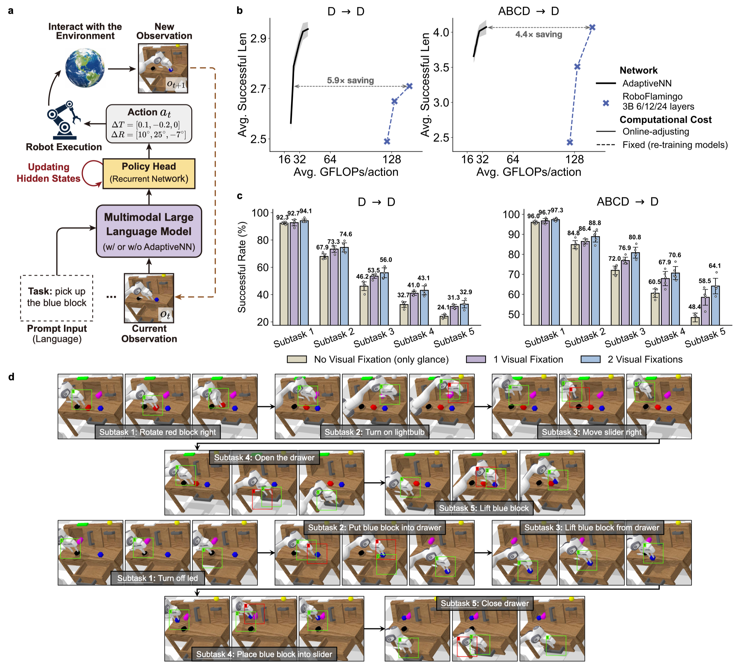 研究團隊進一步將AdaptiveNN應用于具身智能的基礎模型——視覺語言動作模型(VLA)。結果表明,該框架在復雜操作場景中顯著提升了具身基礎模型的推理與感知效率,在保持任務成功率的同時將計算效率提升4.4至5.9倍。