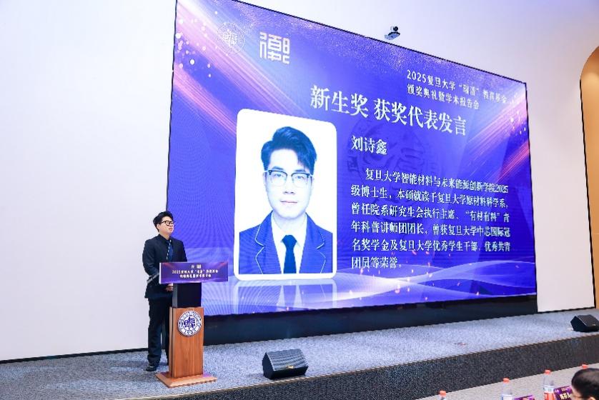 在復(fù)旦已度過(guò)七個(gè)春秋,剛剛開啟博士生涯的智能材料與未來(lái)能源創(chuàng)新學(xué)院2025級(jí)博士生劉詩(shī)鑫同學(xué)代表全體獲獎(jiǎng)新生發(fā)言?!拔业目蒲兄肥菑暮闷孀呦驁?jiān)定、從摸索走向?qū)W⒌倪^(guò)程。”他引用汪國(guó)真的詩(shī)句與新生們共勉:“既然選擇了遠(yuǎn)方,便無(wú)懼風(fēng)雨兼程”。希望共同珍惜這份榮譽(yù),在復(fù)旦的沃土上扎根生長(zhǎng),以探索之心追求真理,以創(chuàng)新之力回應(yīng)時(shí)代!